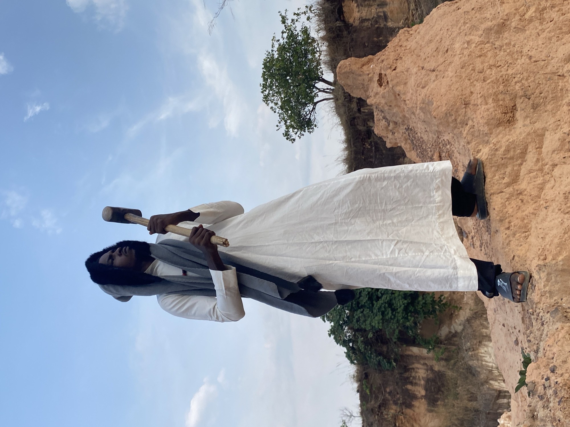 The image depicts an individual standing on an eroded, reddish-brown earthen mound under a partly cloudy blue sky, located in the city of Nguzu Edda, Nigeria. The subject, an individual with a dark complexion, wears a long, loose-fitting white garment over black trousers, paired with black slide sandals. A grey hooded garment with a dark, textured trim covers their head and drapes over their shoulders. The individual holds a heavy-duty hammer or mallet, featuring a dark, cylindrical head and a light-colored wooden handle, gripped with both hands and angled upwards to the right. The gaze is directed towards the upper right of the frame. The immediate environment consists of uneven, reddish-brown soil with sparse dry grasses. In the mid-ground, a vibrant green tree stands atop a distant earthen ridge, with further eroded land formations visible in the background.