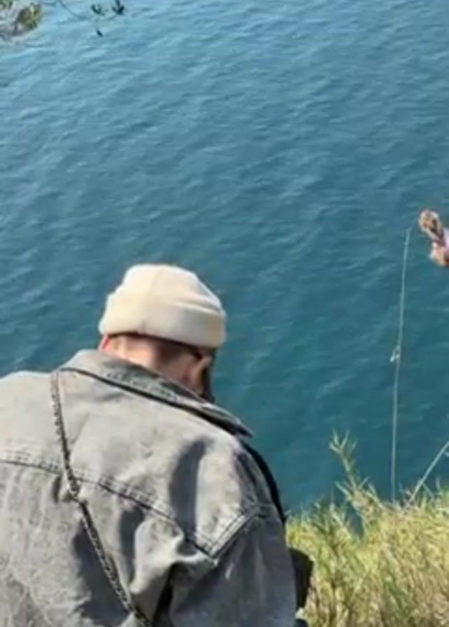 A person wearing a gray denim jacket and a cream-colored beanie stands on a cliff edge looking down. The person has a chain across their back, attached to what appears to be a small bag or camera. Below the cliff edge is a view of the ocean. The day appears sunny. Some greenery grows on the cliff edge.