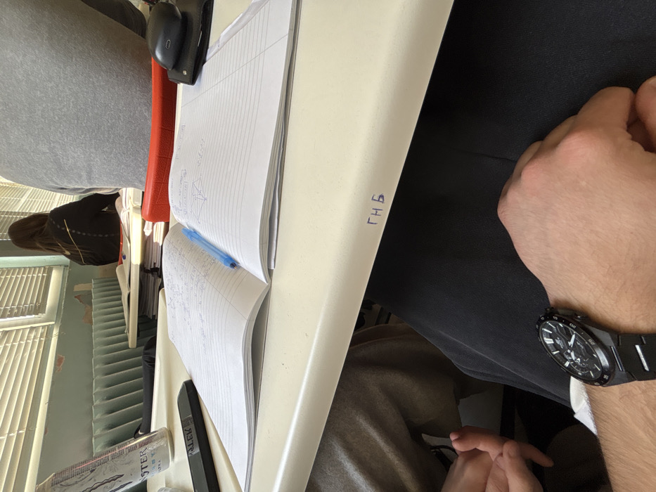 The image depicts an indoor scene, likely a classroom or lecture hall, viewed from a seated, first-person perspective. The location is Plovdiv, Bulgaria, specifically identified by the blue Cyrillic letters "ГНБ" (Гимназия по Народно Стопанство or National Humanities High School) inscribed on the front edge of the white desk in the immediate foreground. In the foreground, the right forearm and hand of the individual holding the camera are visible, wearing a black wristwatch with a dark face and a black metal link strap, resting above the individual's black-clad left thigh. To the left, the knee and upper thigh of another individual, wearing light grey trousers, are partially visible. The central mid-ground features a white desk surface. An open, lined notebook displays handwritten notes and geometric diagrams in blue ink across both pages. A light blue ballpoint pen rests within the notebook's spine. To the left of the notebook, a silver Monster Energy Ultra beverage can is present, along with a black rectangular electronic device marked "ALEK." To the right of the notebook, a black wallet or small pouch holds a small, black, rounded electronic device, possibly a wireless earbud case or a compact computer mouse. Beyond the desk, two individuals are seated with their backs to the camera. The closer individual wears a plain grey long-sleeved top. The individual further back, positioned near a window, has long dark hair and wears a dark long-sleeved top, possibly black, with a faint lighter-colored design across the upper back. The background on the left features a window with horizontal blinds, allowing natural light to enter and create sunlit streaks across the desk. Below the window, a light-colored radiator with vertical fins is mounted against a wall. The wall exhibits signs of wear, with patches of light green paint chipping to reveal a lighter, possibly off-white, layer underneath.