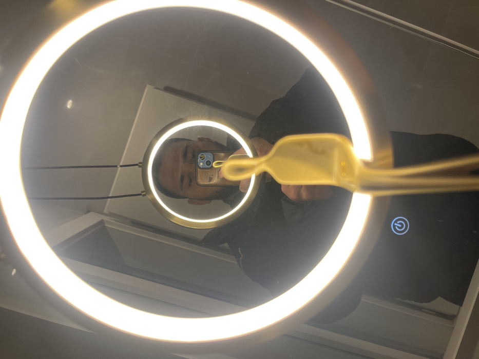 An adult male is captured in a mirror selfie within a modern indoor setting. The primary reflective surface is a large, circular mirror featuring a broad, glowing white LED light ring and a blue illuminated power symbol touch control at its lower center. Reflected centrally within this mirror is a smaller, suspended circular light fixture, characterized by a narrower glowing white LED ring encased in a bronze-colored frame, hanging from two dark cables. The male subject, partially obscured by the smartphone he holds, has short dark hair, a beard, and wears a dark-colored jacket. He is holding a light blue/grey smartphone with a multi-lens camera array and a small, lighter-colored attachment on its rear, pointed towards the mirror to photograph his reflection. In the immediate foreground, a blurred, translucent, golden-colored, abstract human-like figure or trophy stands upright, positioned between the camera and the mirror, partially obscuring the reflection of the male and the smaller light fixture. The environment beyond the reflections appears to be a clean, light-colored interior room, consistent with a modern bathroom or vanity area. The specific location within Sofia, Bulgaria, cannot be definitively identified from the image content alone.