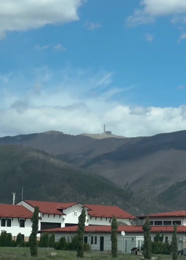 The video appears to be taken from inside a moving vehicle, possibly a car, driving on a paved road towards a building complex. The complex consists of multiple buildings with white walls and red roofs, situated in a flat area. The focus shifts to a mountain range in the background, on top of which stands a prominent structure. The structure is a large, round building with a tall spire extending upwards, seemingly isolated on the mountain peak. The sky is blue with scattered white clouds, and the weather seems clear. There are trees and power lines visible near the complex and in the foreground. The camera zooms in slightly on the structure on the mountain.