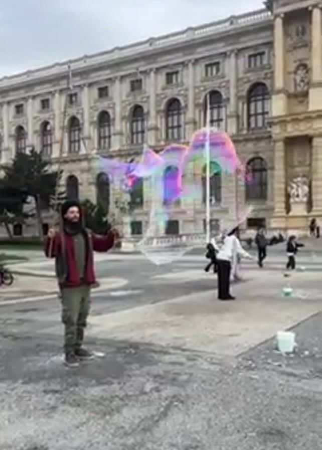 street performer making giant soap bubbles in a public square in front of a large, ornate building