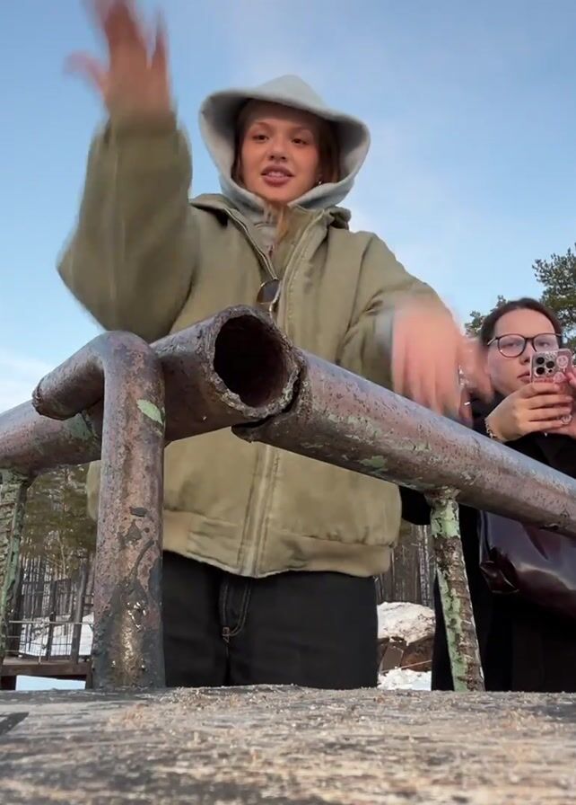 Two young women are standing behind a metal structure in an outdoor setting. The woman on the left is wearing a hooded jacket, black pants, and has sunglasses hanging from her jacket. She is smiling and waving with both hands. The woman on the right is wearing a black coat, glasses, and holding a cell phone, appearing to take a photo or video. The metal structure in front of them has a horizontal pipe with other metal bars extending from it. Behind them, there are trees, some snow on the ground, and a building in the background under a blue sky.