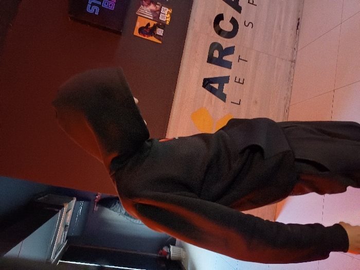 A person wearing a black hooded sweatshirt faces away from the camera. The individual's head is turned towards the left. To the right, "ARCADE LETS SP" is visible on a light-colored wall with dark lettering. Above the individual, there is a flat surface that is red towards the left and light-colored near the wall. Below the individual, there is a lower flat surface that is gray and appears to have a metal frame towards the left.