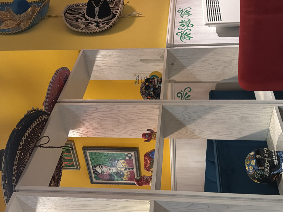 The image displays the interior of a Mexican-themed restaurant or cafe in Plovdiv, Bulgaria. The scene is characterized by a prominent, light-colored wooden shelving unit acting as a room divider, extending vertically through the frame. On the top shelf, a dark sombrero with white embroidery and a dangling black cord is positioned on the left, beside a smaller pink sombrero. Below this, on a middle shelf, a framed portrait of a woman resembling Frida Kahlo with a green background is centered. To its right, two small colorful ceramic figures, one resembling a cactus, are present. Further right on the same shelf, a multi-colored decorative skull with intricate patterns is visible. On the lowest visible shelf in the foreground, another detailed, multi-colored decorative skull rests. The background wall is painted a bright yellow. On this wall, to the right of the shelving unit, multiple decorative sombreros are hung, including a blue and gold one and a black and white one with elaborate stitching. A "Glovo Awards 2023" sign, indicating a commercial establishment, is partially visible on the yellow wall in the mid-ground. The lower sections of the walls feature light-colored paneling with green scrollwork decals. Behind the shelving unit on the left, a section of dark teal upholstered seating is visible. On the right, a portion of red upholstered seating is present in the foreground, and a white wall-mounted heater with horizontal vents is visible on the far right. No individuals are present in the frame, and no actions or interactions are depicted.