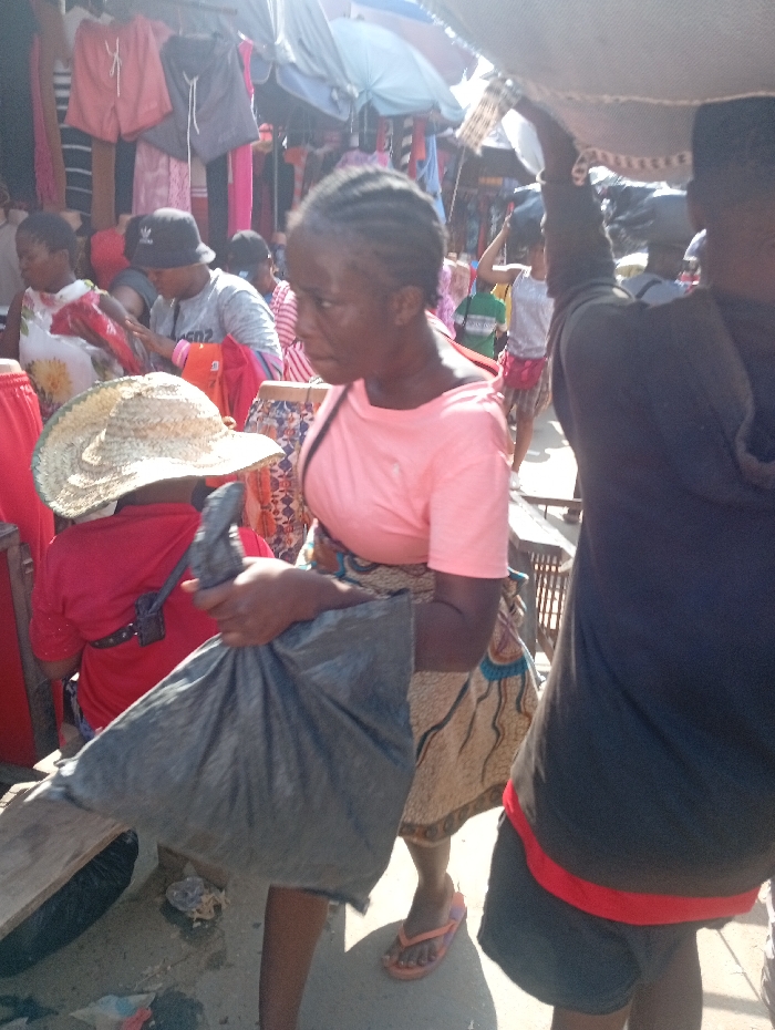 A woman in a pink shirt and patterned skirt holds a gray plastic bag in a crowded outdoor market. She wears sandals and has her hair in braids. Another woman wears a straw hat and red shirt nearby. Clothing is displayed in the background. A person wearing a dark shirt and shorts carries something on their head, partially obscuring the view. Other people are milling about, contributing to the market's busy atmosphere.