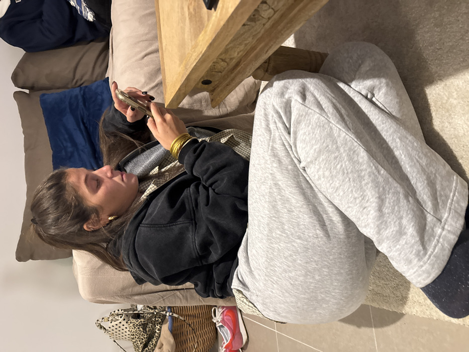 A young woman lies on a beige sofa, engrossed in her phone. She wears gray sweatpants, a black hoodie, and gold bracelets. Her hair is pulled back. Beside her, a wooden coffee table sits next to the couch. A blue pillow and dark-colored jacket rest on the sofa as well. A basket with items and red-and-white shoes are also visible near the couch. The scene is illuminated by warm, indoor lighting, creating a relaxed atmosphere.