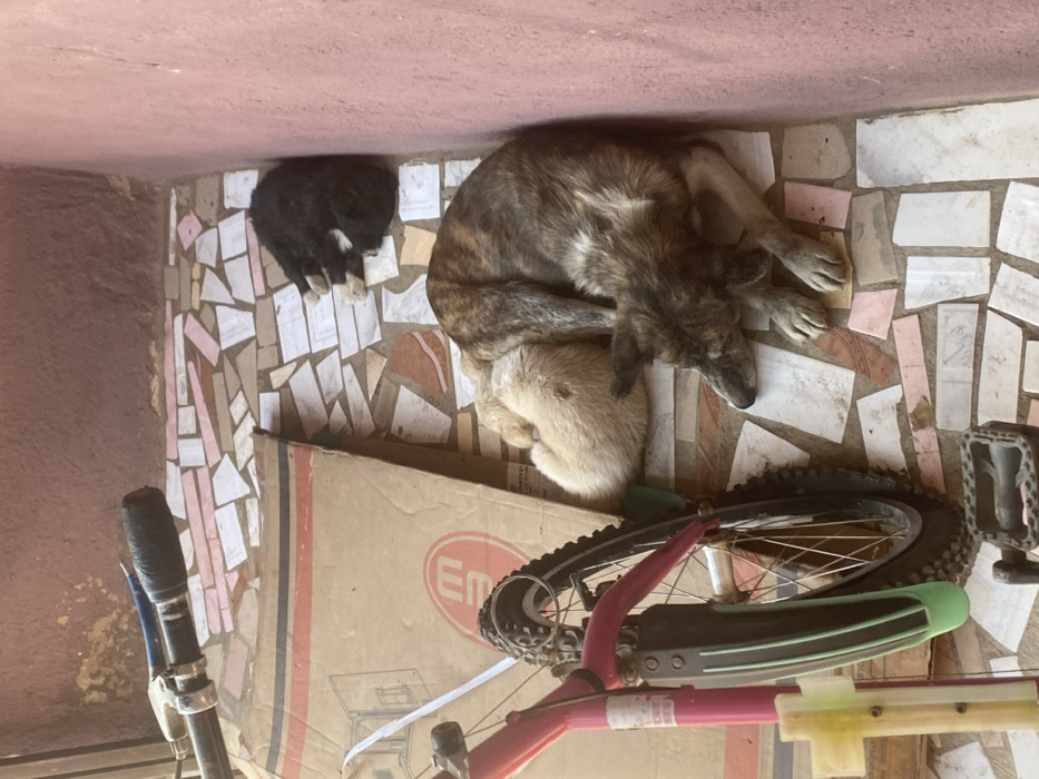 The image captures a ground-level scene in Rafin Par, Nigeria, presenting three animals resting near a corner formed by two walls. On the multi-colored mosaic-tiled floor, a medium-sized brindle-patterned dog is curled up on its right side, sleeping, its head resting on the tile. Positioned directly behind and partially obscured by the brindle dog is a smaller, light-colored dog or puppy, tightly curled in a sleeping posture. Further to the right and slightly behind these two, a black cat with white paws is also curled tightly against a reddish-brown textured wall, appearing to be asleep. To the left of the animals, a significant portion of a bicycle is visible. It features a pink frame, a black handlebar grip, a front wheel with a black knobby tire and a green mudguard, and a black pedal. A light-colored, possibly translucent, cross-shaped object is attached near the bicycle's front wheel. Between the bicycle and the animals, a large, flattened brown cardboard box or sheet lies on the floor. The cardboard bears partial branding, including the letters "EM," and line art depicting a structural outline. The background behind the cardboard and above the animals reveals a textured, light brown or beige wall. The scene is illuminated by natural light.