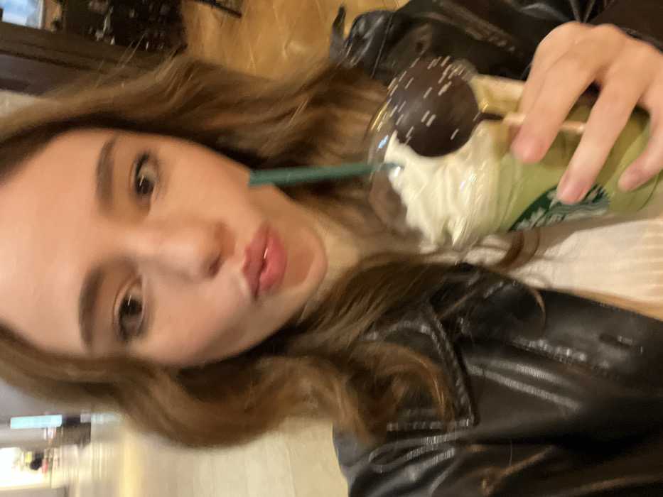A person with light brown hair and fair skin is holding a Starbucks drink