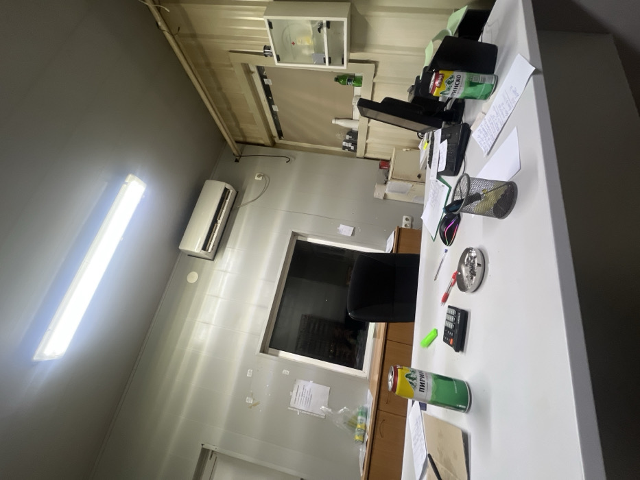 The scene depicts an interior office or workspace, characterized by functional furnishings and various items, located in Radinovo, Bulgaria. The room features light grey, possibly insulated, wall panels and a grey ceiling with a bright, ceiling-mounted fluorescent light fixture. A white, wall-mounted air conditioning unit is positioned on the upper left wall. In the immediate foreground, a white desk surface is cluttered with objects. A green and yellow "Пиринско" (Pirinško) beer can is on the left, near a brown folder. Centrally, a black calculator, a bright green highlighter pen, a stainless steel ashtray containing several cigarette butts and ash, a red pen, and a pink computer mouse are present. To the right, a black metal mesh pen holder, scattered papers, a black computer monitor, a black keyboard, and a second "Пиринско" (Pirinško) beer can are visible. In the mid-ground, a wooden counter or desk runs along the back wall, beneath a large rectangular window. White papers are taped to the wall above this counter. A black office chair is positioned centrally in front of the window, through which a vague reflection resembling a person's head can be observed against a dark background. On the left side of this counter, a clear plastic bag holds yellow fruit. The right side of the room features walls made of vertical light brown corrugated metal panels. A small, wall-mounted white cabinet with clear doors, possibly containing medical supplies and marked with a red cross symbol, is affixed to this wall. Below it, a shelf holds various bottles and containers. No individuals are explicitly visible, but the arrangement of personal items and the presence of an ashtray with butts indicate recent human presence and activity within the workspace.