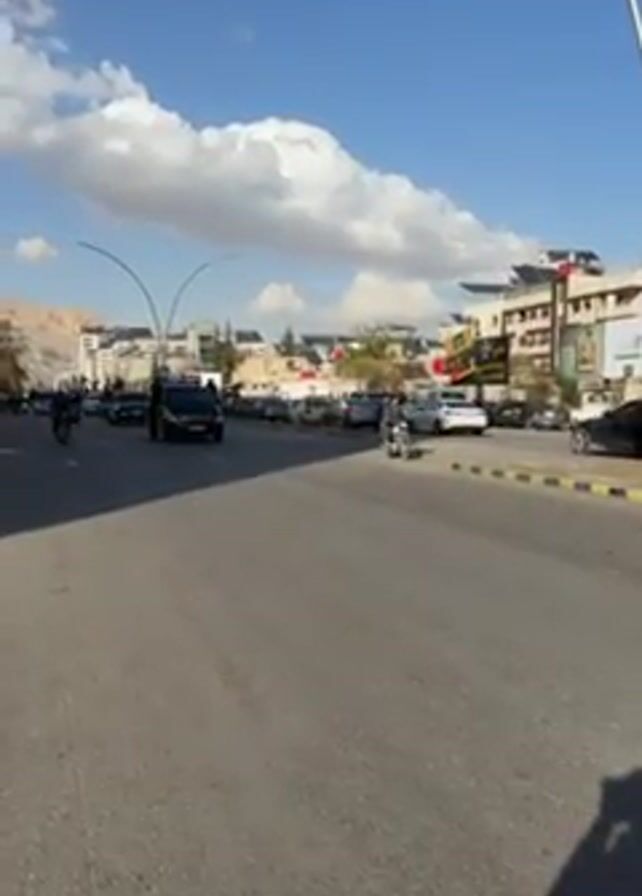 black van driving down a road with a police motorcycle escort. The van has flashing blue and red lights on its roof. The road is lined with parked cars and buildings. There are people on motorcycles riding alongside the van. The sky is blue with white clouds. There is a person standing on the sidewalk to the right of the road, partially visible at the bottom of the frame.