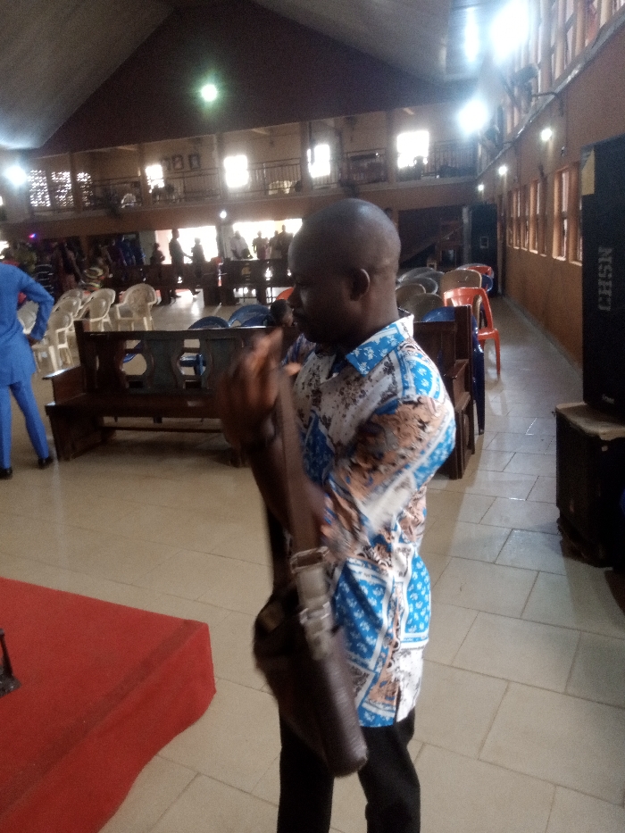 The image depicts an indoor scene within a large hall or facility in Nsugbe, Nigeria, filled with people. In the mid-ground, a dark-skinned male subject with a bald head is positioned in profile, facing right. He wears a collared shirt patterned in blue, white, and brown, black trousers, and a dark brown messenger bag slung across his right hip. His hands are raised and slightly blurred, indicating movement or gesturing. To the subject's immediate left, a person dressed in a light blue outfit is partially visible, facing away from the camera and standing near a raised red-carpeted platform. The floor is tiled. In the background, numerous individuals are present on a ground level and an upper balcony or gallery, their figures largely indistinct due to distance and lighting. The hall features a high ceiling with visible brown structural beams and bright overhead lights. Along the right side of the frame, several rows of varied seating are visible, including red, blue, and white plastic chairs, as well as dark wooden benches. A large black speaker box or equipment case, partially displaying the text "CHSN," stands on the far right.