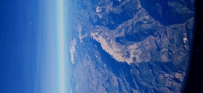 An aerial view showcases a rugged landscape, likely mountains, blanketed in a mix of greenery and exposed rock. The earth transitions to a blue atmosphere, punctuated by a small celestial object, possibly the moon. The edge of a window frame is visible in the lower right corner, suggesting the photo was taken from an aircraft. The horizon is distinct with a layered blue effect.