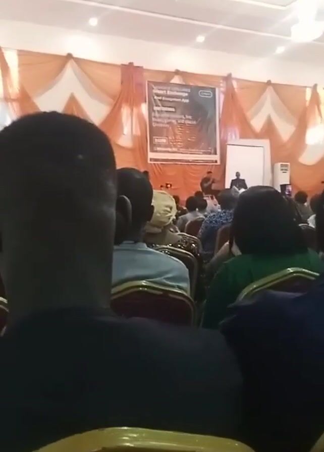 n audience seated in a room, presumably attending a presentation or conference. Most people are facing the front, where a stage is set up. There are individuals on the stage, and a banner is visible in the background. The chairs are arranged in rows, and the room is well-lit. The video is taken from the perspective of someone sitting in the audience.