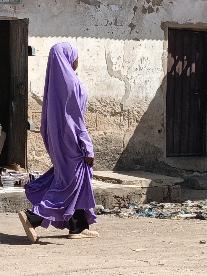 An individual is depicted walking right-to-left on an unpaved, light brown dirt ground in what is presumed to be Zango, Nigeria. The person is dressed in a flowing, long-sleeved purple garment that covers the head and body, with black trousers and light-colored, possibly woven flat shoes visible beneath. The right hand appears to be holding or adjusting the fabric of the purple garment near the hip. Behind the individual, a weathered, light-colored wall with peeling plaster and cracks forms the backdrop. To the left, a dark, vertically planked wooden door or gate stands open, revealing a dark interior. To the right, another dark, vertically planked wooden door is closed, set into the wall above a raised concrete or stone step. A prominent triangular shadow is cast on the wall from the right door frame, indicating strong overhead sunlight. On the ground near the base of the wall and step, an accumulation of various pieces of debris, including plastic bags and other refuse, is visible. Indistinct items, possibly household goods or merchandise, are also visible on the ground near the open door on the left. Shadows from the individual and objects are clearly cast on the ground.