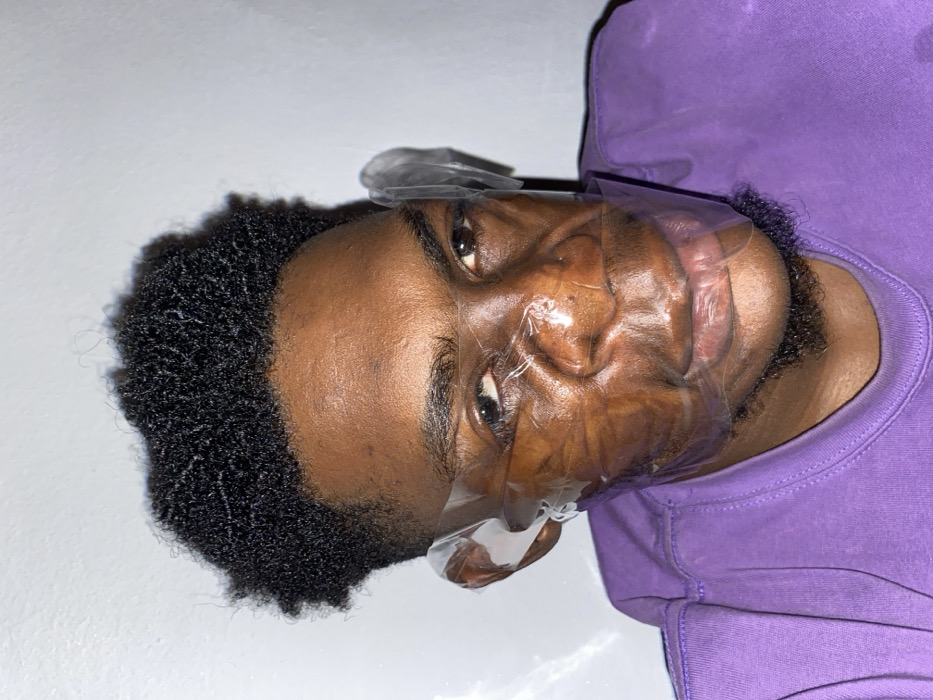 A close-up portrait depicts an adult male with dark skin, short black curly hair, and light facial stubble, wearing a purple crew-neck t-shirt
