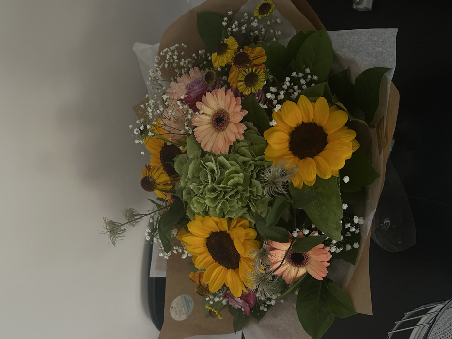 The image displays a multi-floral bouquet, captured from a slightly elevated perspective