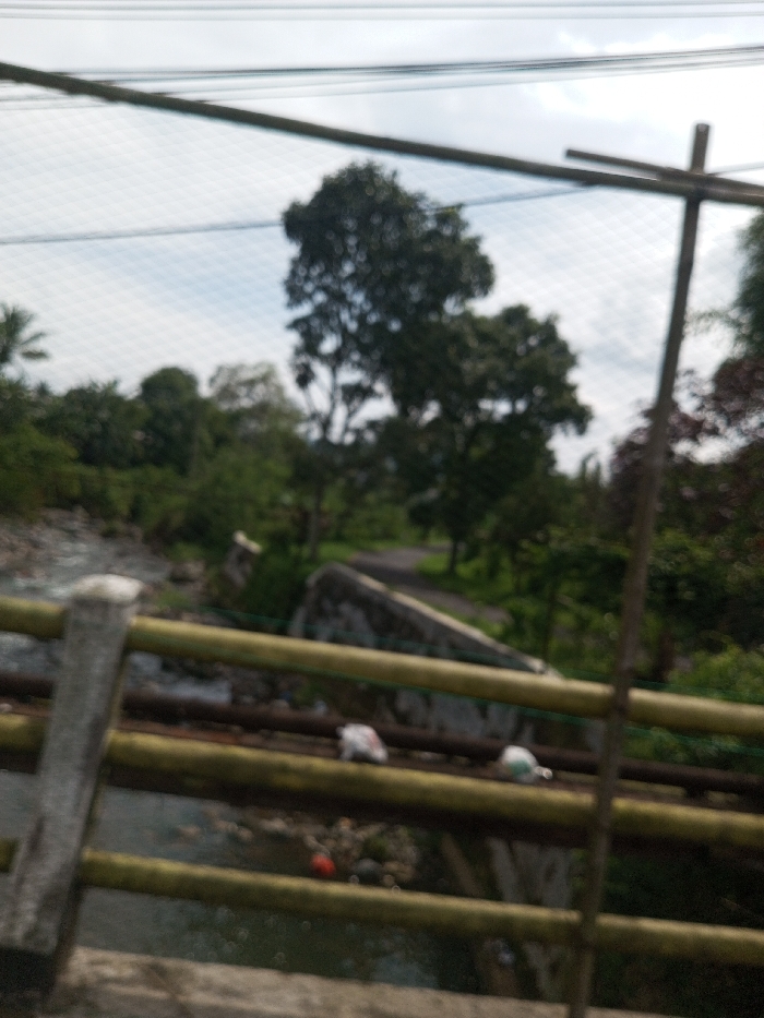 The image depicts an outdoor scene in Namthoung, Laos, captured from an elevated position, likely a bridge or similar structure. The foreground is dominated by elements of a railing system: a light-colored concrete pillar on the left, several horizontal yellowish-brown bars, and a thin, dark vertical pole on the right. Multiple dark horizontal lines, consistent with power or communication cables, span the upper portion of the frame against an overcast sky. A subtle grid-like pattern, possibly a net or screen, is visible across the upper and mid sections of the image. Below the railing, a body of water, likely a river or stream, flows from left to right, with visible rocks and debris along its banks and within the water. Several small, light-colored objects, resembling discarded plastic bags, are visible resting on the lower horizontal bars of the railing. A distinct red object is partially submerged or located on the riverbed. In the midground, an arched concrete structure, appearing as a weathered bridge or culvert, spans the water. Beyond this structure, a dark, unpaved or asphalt road curves slightly to the right, disappearing into a densely vegetated area. The background consists of numerous deciduous and evergreen trees, forming a thick canopy of dark green foliage. The sky is largely overcast, displaying light grey cloud cover. No individuals are discernible within the frame, and no specific actions or interactions are depicted. The environment appears rural or semi-rural.