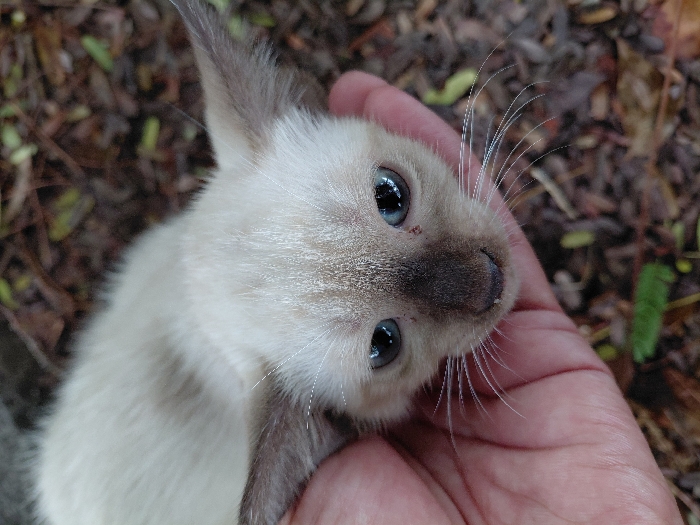 The image depicts a light-colored kitten, exhibiting cream fur with dark brown colorpoint markings on its face, ears, and nose. Its eyes are light blue, and it has prominent white whiskers. A human hand, with light skin, gently supports the kitten's head from beneath. The background is an out-of-focus outdoor setting featuring ground covered with brown fallen leaves, small twigs, and sparse green vegetation. This scene is identified as taking place in Banda Aceh, Indonesia.