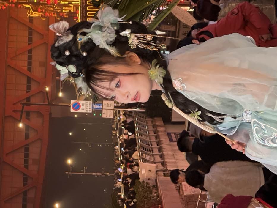 The image captures a nighttime urban scene in Yuzhong District, China, filled with artificial illumination and a dense crowd. In the foreground, positioned on the right, is a young East Asian female, shown from the chest up, facing left with her head angled slightly to her right, observing something in the distance. She is dressed in an elaborate traditional Chinese costume, likely a Hanfu, in shades of light blue and white, featuring sheer, flowing sleeves and potentially iridescent fabric on the skirt. Her dark hair is styled into an intricate updo adorned with bangs, numerous hairpins, light green and white artificial butterflies and feathers, and dangling golden ornaments with blue jewels and beads. Her makeup includes winged eyeliner, pink eyeshadow, and pink lipstick. She holds a long, slender, light-colored object, possibly a fan handle or staff, embellished with small green floral elements, over her left shoulder. The background reveals a bustling multi-level environment. To the left, an elevated walkway or street is densely populated with pedestrians. Beyond them, a line of yellow taxi cabs is visible on a lower road. A silver metal railing separates the foreground level from the street below. A blue circular traffic sign with a red diagonal line is present, beneath which a rectangular sign displays Chinese characters: "区域" (Area), "限时6分钟" (Time limit 6 minutes), "全路段开放" (Entire road section open), and a green directional arrow pointing to "入口" (Entrance). Overhead, a massive reddish-orange steel truss bridge structure spans across the upper portion of the frame. To the far right, partially obscured by the main subject and palm-like foliage, an illuminated multi-story building featuring traditional Chinese architecture and numerous red lanterns is visible.