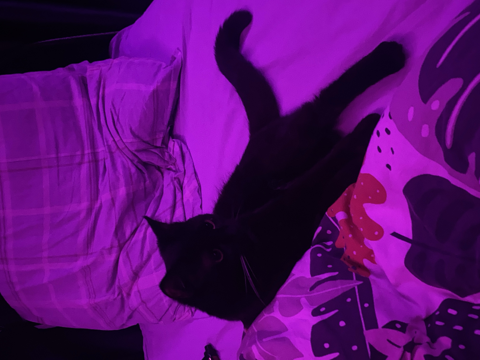 A domestic black cat is observed lying on a bed. The cat's fur is uniformly black, with visible white whiskers and prominent amber-colored eyes reflecting the ambient light. It is positioned with its head slightly raised, looking towards the right side of the frame, and its body extended across the bed, with its tail visible and curled. The bed is covered with a white or light-colored fitted sheet and a duvet featuring a multi-colored pattern of stylized leaves and dots, primarily in shades of purple, dark grey/black, red, and white. A large, light-colored pillow with a faint plaid or striped pattern is visible behind the cat's head. The entire scene is intensely illuminated by a magenta-purple light source, casting a strong, monochromatic hue over all surfaces and the cat, with shadowed areas appearing very dark. The background appears dark and indistinct, consistent with a darkened room relying solely on the colored light source. No individuals are present. No discernible landmarks or specific environmental details are visible to determine a precise location within the city of Izhevsk, Russia. The scene depicts an indoor, likely residential, bedroom setting.
