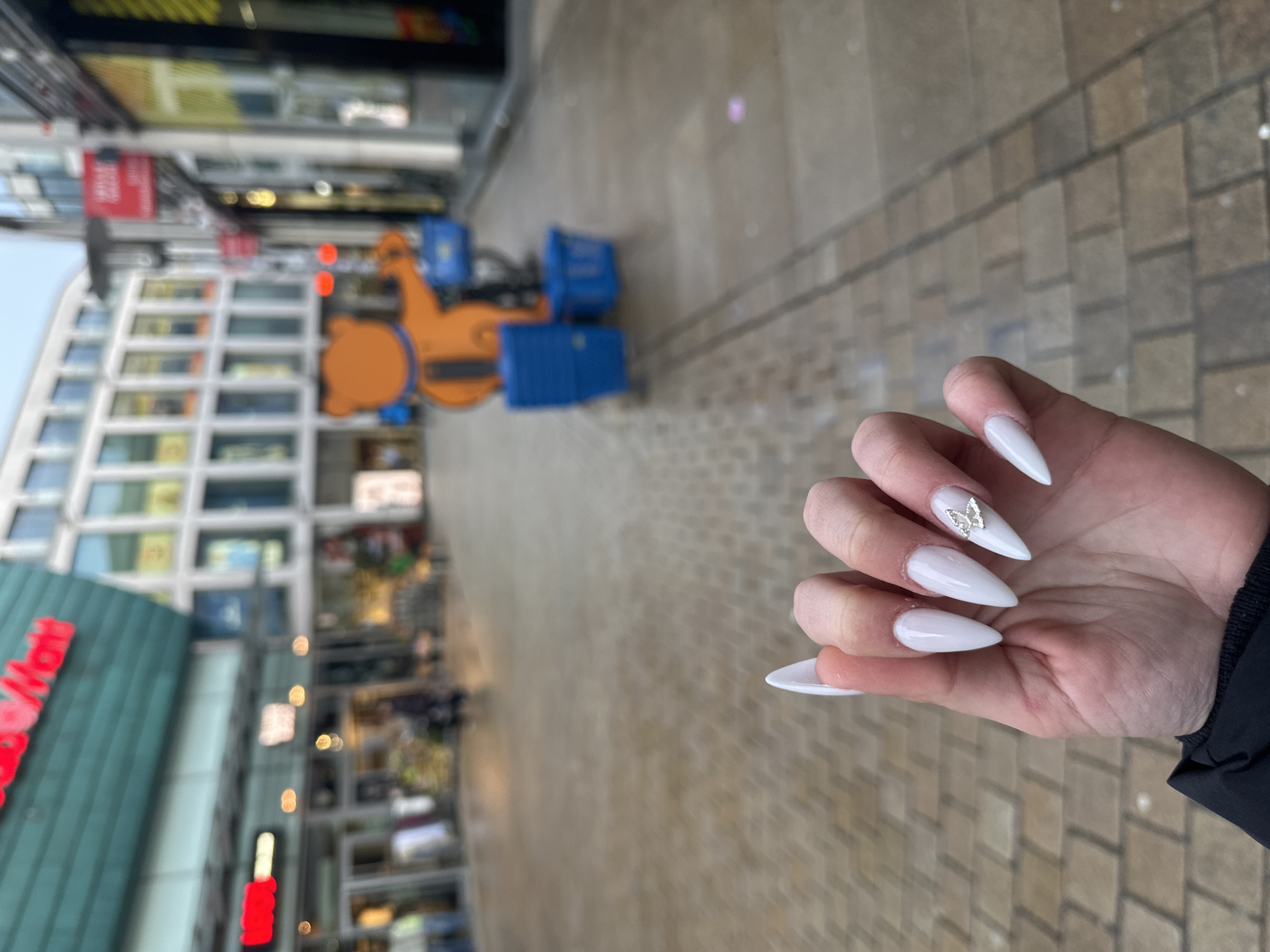 person's hand with long, white stiletto nails, one adorned with a silver butterfly embellishment. The background is a street scene, blurred and indistinct, but identifiable as being in Osnabrück, Germany. Key visible features include a blue and orange sculpture, likely a public art installation or advertisement, and a building with a prominent "MediMax" sign, a German electronics retail chain. The scene is outdoors on a day with overcast lighting. The ground appears to be paved with rectangular stones. The subject is holding their hand out, presumably to showcase the nails.