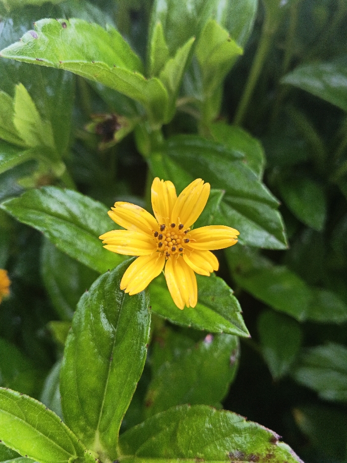 A vibrant yellow flower with a dark center stands out amid lush green foliage. The flower has approximately seven distinct petals. The leaves surrounding the flower are glossy and appear wet. Some leaves show slight discoloration or minor damage. The background is filled with similar green plants, creating a dense and natural setting.