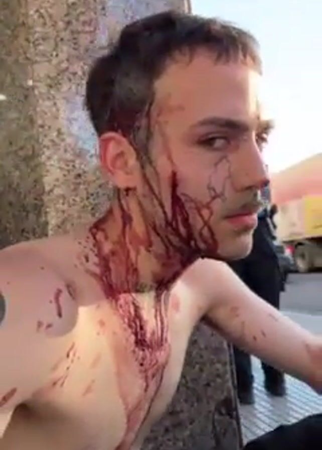 A close-up video shows a shirtless young man covered in what appears to be blood, possibly staged. The blood is concentrated around his face, neck, and upper chest, dripping down his body. He has piercings in his nose and ears, and tattoos on his arm. He is leaning against a building. In the background, there are people and vehicles, indicating an urban setting. The camera is handheld and unsteady, focusing primarily on the man's face and upper body. The lighting suggests daylight.