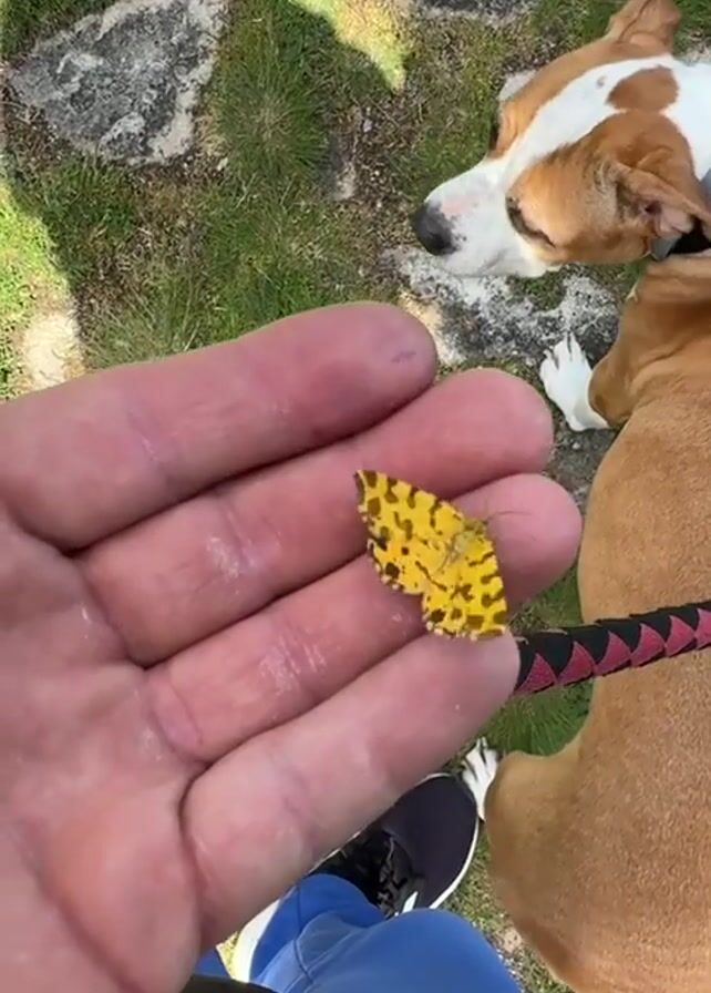 Here is a detailed description of the video: The video shows a person holding a yellow butterfly with brown spots in their hand. The person is wearing blue pants and black shoes with white soles. A dog is standing next to the person, wearing a pink and black leash and a gray collar. The dog is brown and white. The background is a grassy area with some stone slabs. The camera is focused on the person's hand and the butterfly. The lighting is bright and natural.