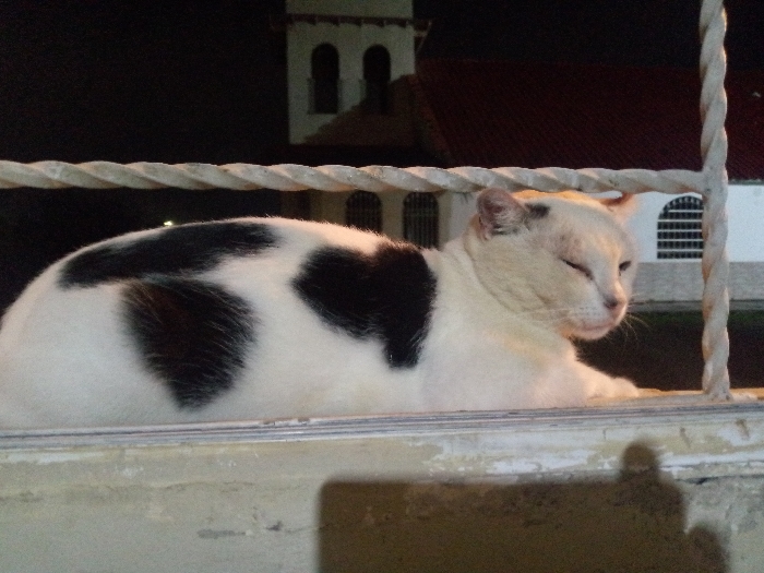 A white cat with black spots rests on a ledge. It's positioned behind a white, twisted rope railing. The cat's eyes are partially closed as if it is sleepy. In the background, there's a blurred building with arches and a red-tiled roof, illuminated by artificial light, set against a dark sky. A shadow appears at the bottom of the image, cast upon the ledge itself.
