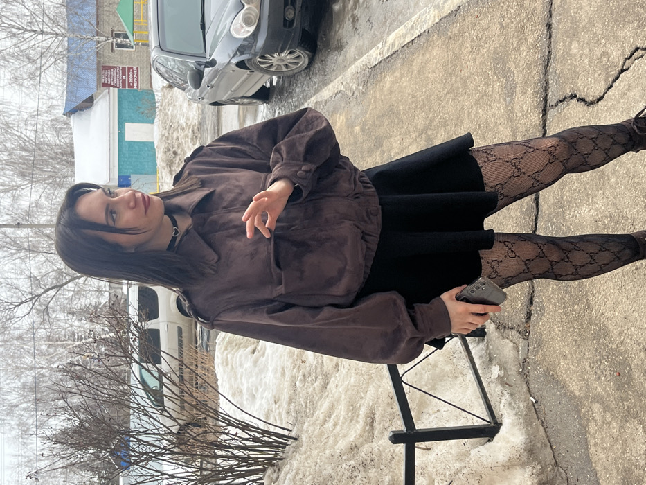 An outdoor, eye-level photograph depicts a young woman standing on a paved surface during what appears to be late winter or early spring. The setting is identified as Vostochnaya St, 32, Engels, Russia, based on Cyrillic signage visible on a background building. **Subject:** A female subject with dark, medium-length hair and light complexion is captured from the mid-thigh up, facing slightly right of the viewer's perspective. She is wearing a dark brown, possibly suede, bomber-style jacket with a wide collar, shoulder epaulets, and elasticized cuffs and hem. Her left arm is down, holding a silver/gray smartphone with three visible camera lenses in her left hand. Her right hand is raised to chest level, fingers slightly curled with the thumb touching the index fingertip. She wears a black pleated mini-skirt, black fishnet stockings with a repeating 'GG' pattern, and a black choker featuring a silver heart-shaped pendant around her neck. Her head is turned slightly to her right, and she is looking in that direction with a subtle facial expression. **Environment:** The ground consists of cracked, dark grey asphalt or concrete. To the subject's left, a patch of dirty, melting snow is present behind a low, black metal fence segment. Behind the snow and fence are dormant bushes with thin, bare branches. Further left, a white minivan is partially visible. In the background, beyond the paved area, a dark grey sedan (Hyundai Sonata) is parked. Further behind the vehicle is a light blue and white building with a dark blue roof. This building features visible Cyrillic text, including "РЕМОНТ ИЗДЕЛИЙ МЕХА И КОЖИ" (Repair of Fur and Leather Products), "АТЕЛЬЕ" (Atelier), and "2000-е МЕЛОЧЕЙ" (2000s Trifles/Small Items). Another building with a green structure is partially visible to the right of the blue building. Bare trees with thin branches are visible in the far background under an overcast sky.