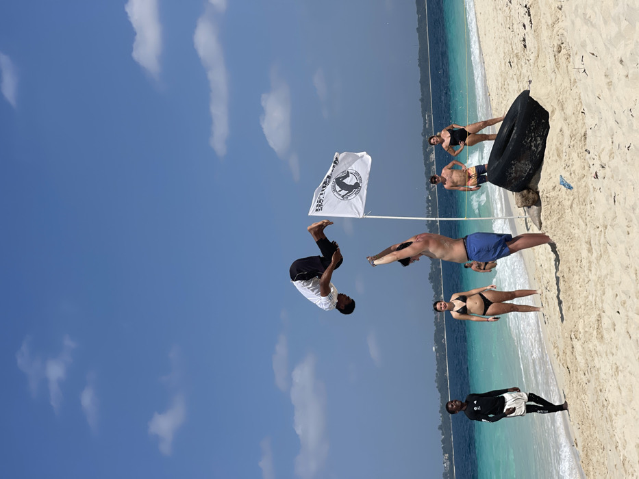 This image depicts a sunny beach scene in the city of Zanzibar, Tanzania. Six individuals are distributed across a light tan sandy beach bordering turquoise ocean water, with a distant landmass visible on the horizon beneath a clear blue sky with scattered white clouds. The central action involves a young Black male, wearing a white short-sleeved shirt and black trousers, performing an aerial backward flip approximately 1.5 meters above the sand, with bare feet and knees tucked. Directly beneath him, a shirtless White male in blue swim shorts stands with arms raised vertically above his head, appearing to spot or brace the acrobat. To the left of these two, near the water's edge, stands a young Black male wearing a black long-sleeved top and white shorts over black leggings. A White female in a black two-piece bikini stands slightly behind the spotter, observing the activity. To the right of the central figures, a white flag featuring a black emblem depicting an acrobat and the partial text "ZANZIBAR" is planted in the sand on a pole. Further to the right, a large black vehicle tire rests partially buried in the sand. Behind the tire, a shirtless White male in patterned swim shorts and a White female in a black one-piece swimsuit stand closer to the water, observing the scene. A small piece of blue debris is present on the sand in the foreground.