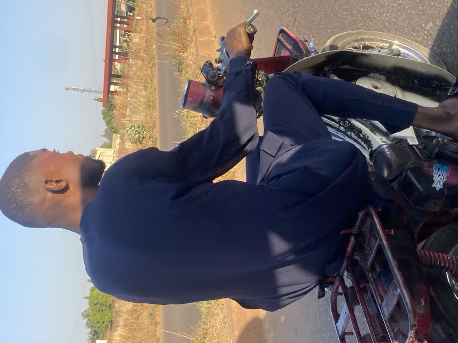 A male individual is depicted seated on a red and white motorcycle on an asphalt road in Sabon Tasha, Nigeria