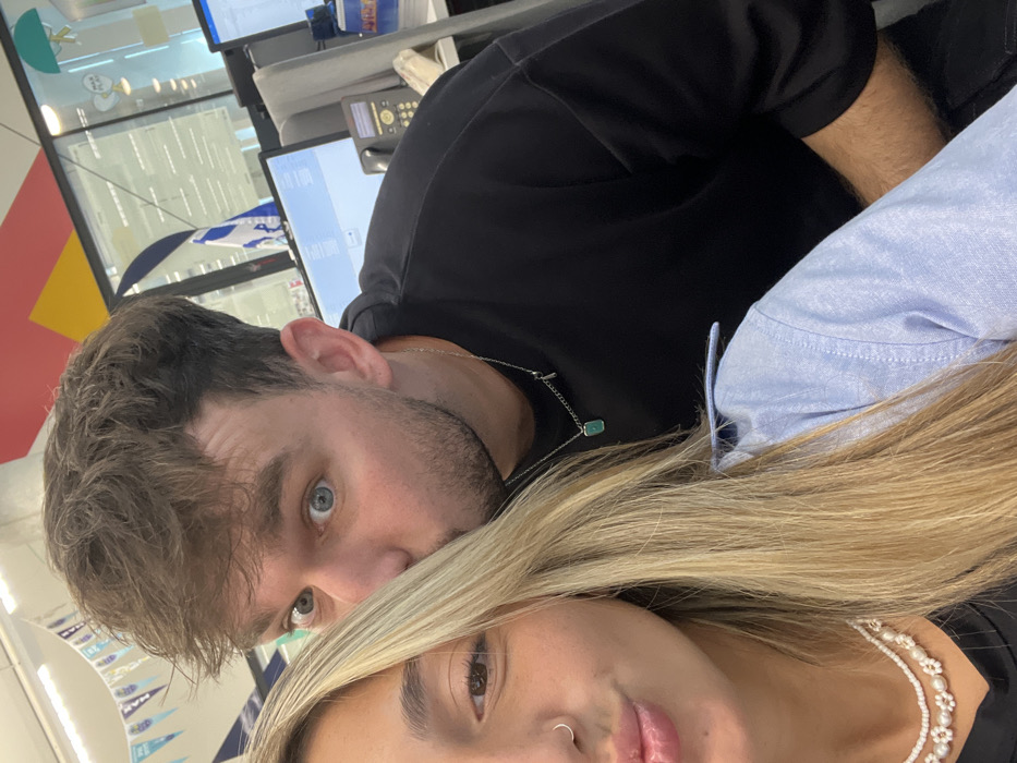 This image depicts two individuals in an office setting located in Bnei Brak, Israel. In the foreground, the left side of a female's face is visible, featuring long blonde hair, a silver nose ring on her left nostril, and lips slightly puckered. She is wearing a light blue collared shirt layered over a dark garment, accessorized with a white beaded floral necklace and a simpler white beaded necklace. Directly behind her, positioned to the right of the frame, is a male with short brown hair and light facial stubble. He wears a black long-sleeved shirt and a silver chain necklace with a rectangular green pendant and a smaller silver charm. His blue eyes are wide open, directed towards the camera, as he appears to be kissing the female's hair or temple area. The background details an office environment with multiple computer monitors, a desk phone, and various decorative elements. These include a string of colorful pennant banners (blue, white, yellow), a partially visible blue and white flag, geometric shapes in red, yellow, and green on a wall, and a partial "MAX PLAN" sign on a glass partition.