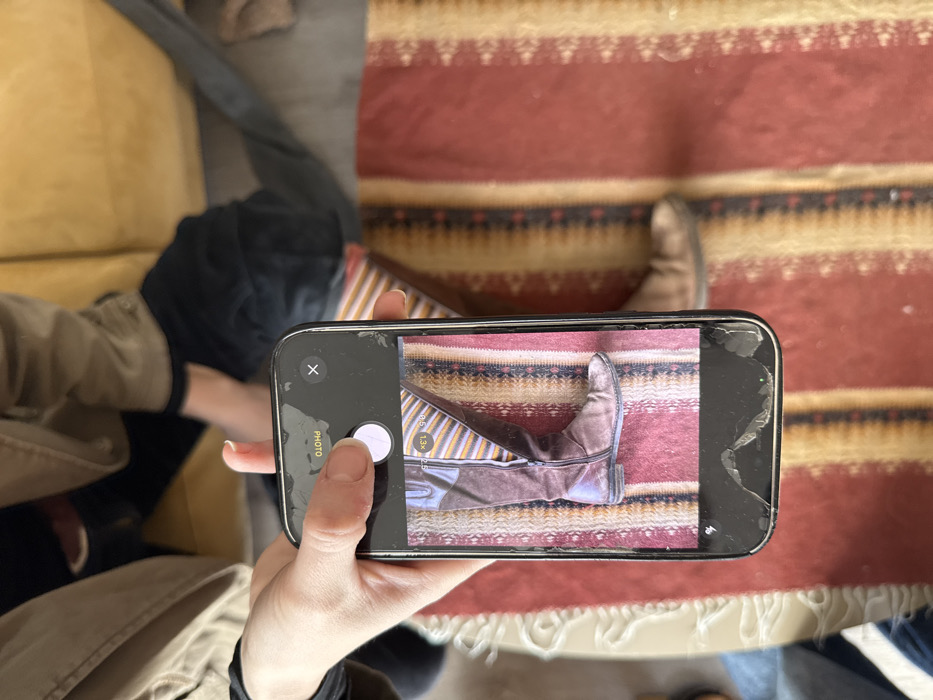 An individual's hands hold a black smartphone in an indoor setting in Or Akiva, Israel. The phone screen displays an active camera interface, showing a dark brown, knee-high boot with a side zipper, positioned vertically on a horizontally striped rug featuring red, maroon, and beige/yellow tones with darker accents. The user's right thumb is poised over the digital shutter button labeled "PHOTO." The bottom portion of the smartphone screen exhibits multiple cracks, particularly in the lower left corner. In the background, a second person is partially visible, seated on a yellow/gold upholstered surface, wearing a light brown jacket, dark trousers, and striped socks on one leg, with a light brown shoe or boot on the other.