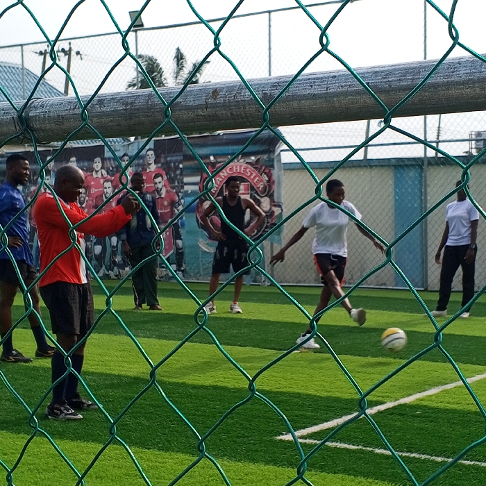 The image displays an artificial turf football pitch in Ohoro, Nigeria, observed through a green chain-link fence with a horizontal metal bar