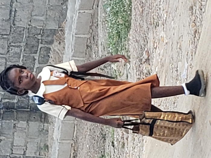 A young girl in a school uniform stands on a dirt path, holding a large, shiny bag. She wears a brown dress over a white shirt and black shoes with white socks. Her hair is braided and pulled back. A backpack strap rests on her shoulder. Behind her is a weathered brick wall and some greenery. The girl looks directly at the camera with a somewhat serious expression. The photo is taken from a slightly angled perspective.