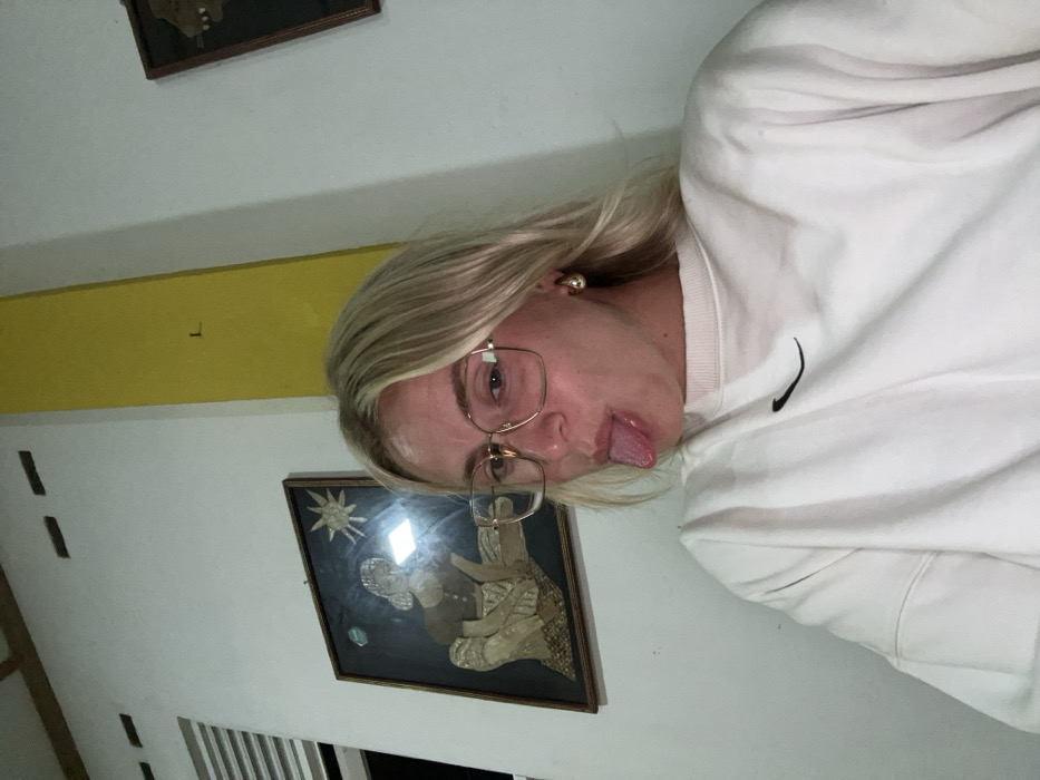 - "The image captures a single fair-skinned individual, appearing female, with shoulder-length blond hair and gold-framed rectangular glasses, making a playful expression with her tongue extended" by FM-bcuvC3, licensed under CC BY 4.0