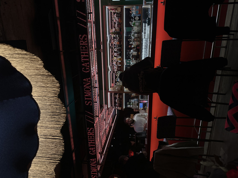 A dimly lit bar interior features a red counter stocked with liquor bottles behind a brightly lit display. Neon lettering reads "Simona Gathers." Several patrons are seated at the counter, one wearing a white shirt. A dark jacket bearing the word "CHAOTIC" hangs on a chair in the foreground. The image is rotated 90 degrees clockwise.