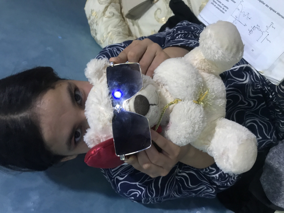 An individual with dark hair and brown eyes is depicted in an indoor setting in Ouislane, Morocco, looking directly at the viewer. Their face is largely obscured by a cream-colored teddy bear held at chest level. The teddy bear is wearing large, dark, rectangular sunglasses; the right lens exhibits a prominent circular blue light. A small red heart is attached to the bear's left ear, and a thin gold-colored string is tied around its neck. The person is wearing a dark blue long-sleeved top adorned with a white, abstract, swirling pattern. To the right of the teddy bear, a white open book or document with text and diagrams (resembling electrical circuit schematics) is visible. The background consists of a plain blue wall on the left and a light-colored pillow or bedding with a subtle gold pattern on the right.
