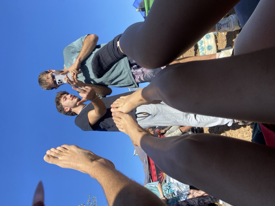 The image depicts an outdoor daytime scene at an event in Yoav Regional Council, Israel, viewed from a low perspective. In the immediate foreground, three sets of legs and feet are visible, raised towards the camera. On the left, a male's bare, hairy left leg and foot are extended. In the center, two bare feet, likely belonging to one individual, are positioned with toes touching. On the right, a leg with a black sock covering the foot and an ankle-worn device is visible. In the midground, two young adult males stand under a clear blue sky. The male on the left, with dark hair, wears a black t-shirt and grey sweatpants, gesturing with his right hand in a "V" or peace sign while looking towards a smartphone. The male on the right, with light hair and a beard, wears sunglasses, a light blue t-shirt, and patterned shorts, holding a white smartphone horizontally with both hands, appearing to photograph or video. The background reveals a dry, light-brown ground surface. A red canopy tent with repeating green cannabis leaf patterns is partially visible on the left, and a green object or structure is on the far right. Faint outlines of distant vegetation are present on the left horizon. A white rug with blue peace signs or symbols is laid on the ground. Several other individuals are partially visible in the deeper background, indicative of a gathering.