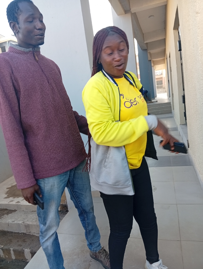 A man and a woman stand outside a building. The man wears a maroon sweater and jeans, holding a black phone. The woman, with braided hair, wears a yellow shirt, a gray and yellow jacket, and black pants. She is also holding a phone and appears to be talking. They are standing in front of a building with a covered walkway. The building is light colored.