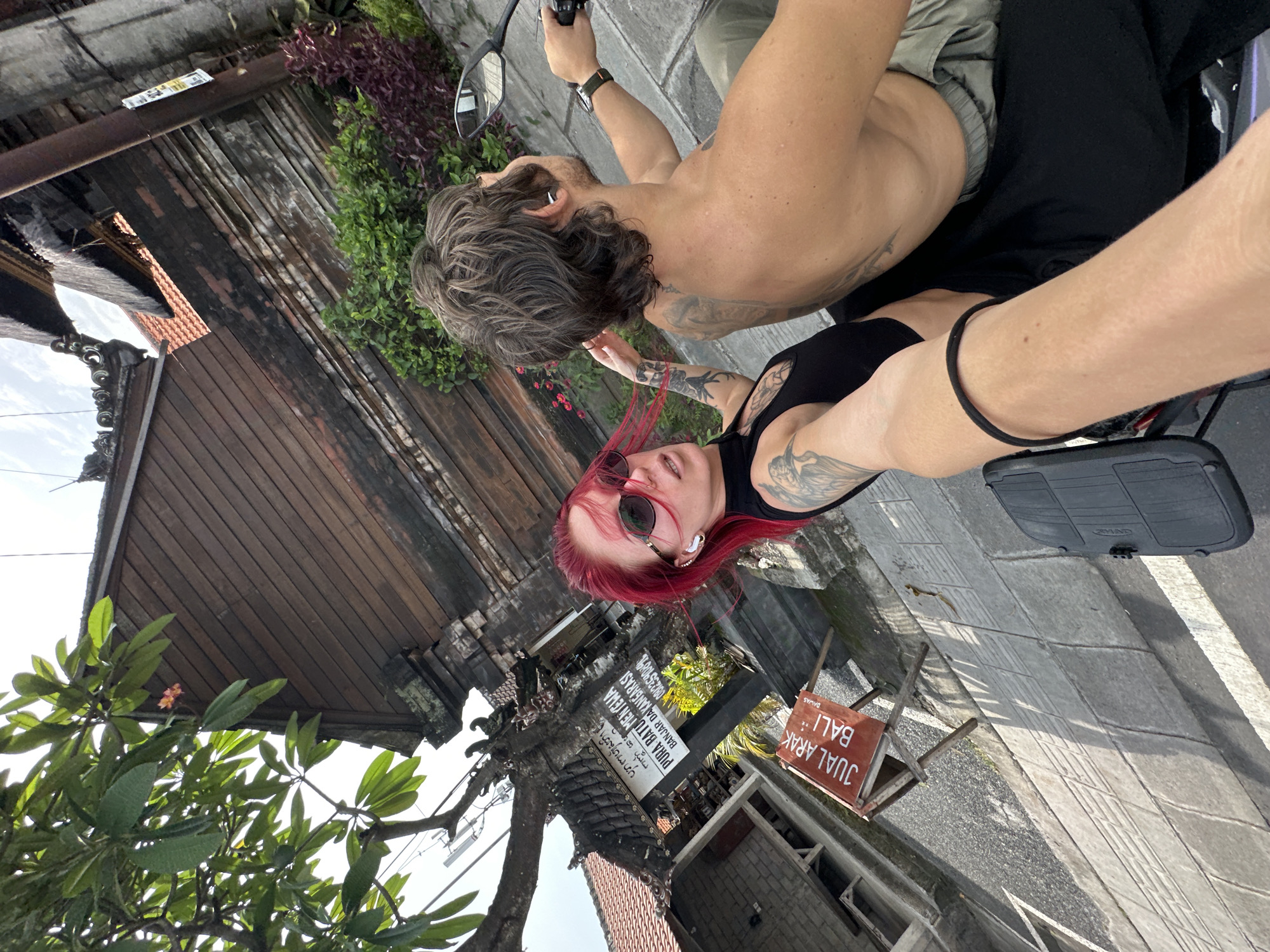 The image displays two individuals on a scooter on a paved street in Kerobokan, Indonesia, during daylight hours. A female passenger, with bright red hair, dark sunglasses, and a black high-neck sleeveless top, is positioned in the foreground, extending her right arm to hold a camera phone for a selfie. She exhibits multiple tattoos on her arms and has white earbuds inserted. Her mouth is slightly open, and she is looking towards the camera. Seated in front of her is a male driver, bare-chested with light brown curly hair and tattoos visible on his upper body. He has his hands on the scooter handlebars, looking forward, and also has white earbuds. The scooter is on an asphalt road next to a grey concrete sidewalk. In the background, traditional Balinese architecture is visible, featuring a dark wooden building with ornate carvings and a tiled roof, indicative of a temple or community hall structure. A white sign with black text, partially legible, reads "PURA BATU MENGAPAS BANJAR" followed by a phone number. Adjacent to the sidewalk, a red A-frame sign with white text clearly states "JUAL ARAK BALI" (Sell Balinese Arak). Lush green and reddish-purple foliage borders the roadside, and a Plumeria tree with pink blossoms is overhead on the left.