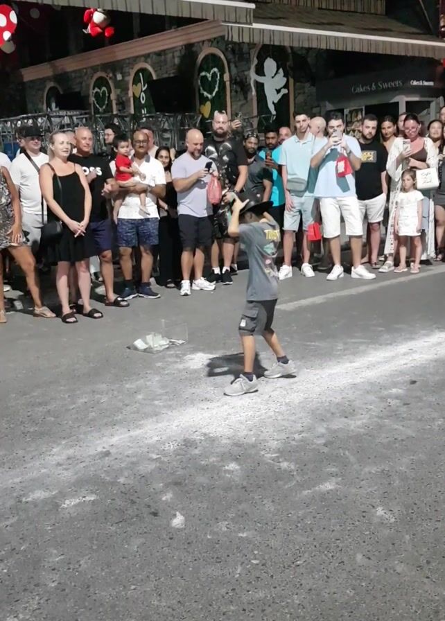 A crowd of about 20 or 25 people are standing on a street in front of a building, looking and pointing to the left. Many of them are holding cell phones and taking pictures. A man is walking in front of them, also looking to the left. The street is gray and cracked. The building has a Corona sign, some decorative hearts, and a sign that reads "Cakes & Sweets." It appears to be nighttime.