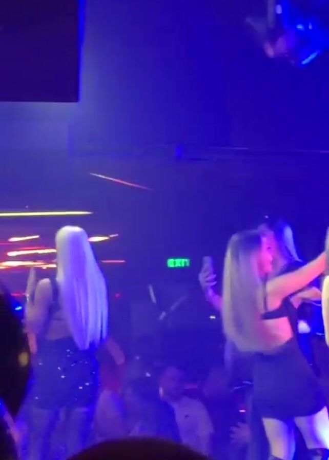 The video takes place in a crowded nightclub, under flashing blue and red lights, with two women onstage dancing with microphones. One woman is wearing a black crop top and shorts. The other is in a black dress. There are other people dancing in the audience and some are recording the women on their phones. Black balloons float near the camera. The word "EXIT" is lit up above the stage.