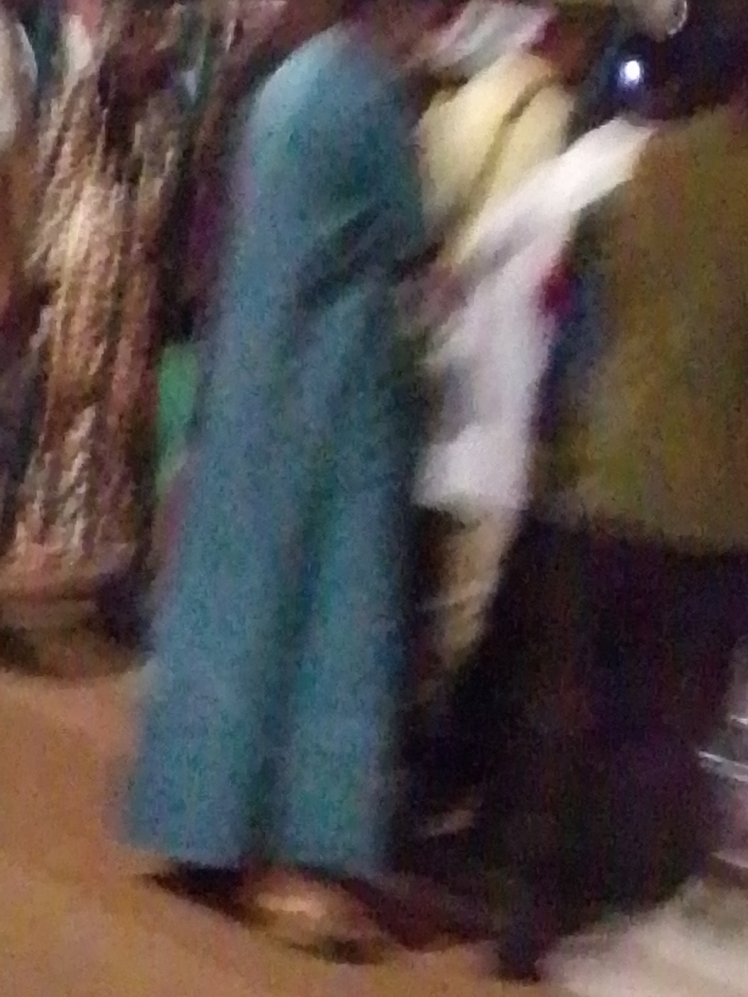 blurred scene with several individuals. A person wearing a light blue garment stands prominently in the center. To their left, another individual is wearing a patterned garment. To the right, partial views of people wearing white and green garments are visible. The exact location within the city of Tamale, Ghana, is not discernible from the image.