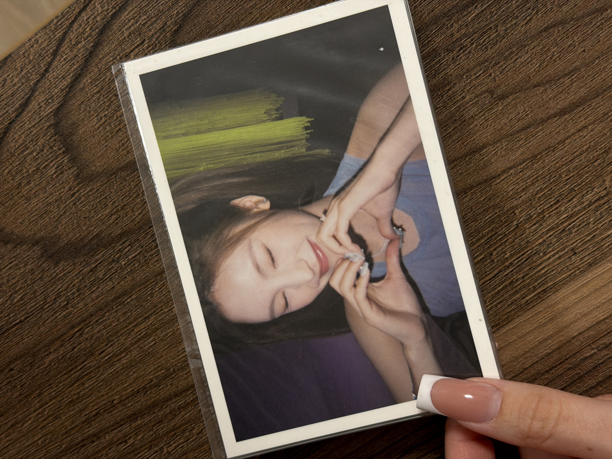 A photo is placed on a wooden surface. The photo depicts a person with fair skin, closed eyes, and a smile. Their hands are raised near their face. The person is wearing a blue garment. There's an indistinct greenish area in the upper portion of the photo. A finger with a white-tipped manicure touches the lower-right corner of the photo. The wood surface beneath the photo features a grain pattern. The photo is encased in a clear plastic sleeve. The location is not discernable from the image.