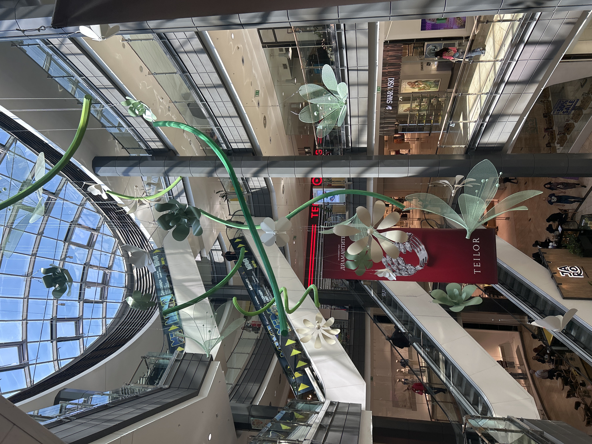 interior of a shopping mall in Sofia, Bulgaria. A large glass dome provides natural light. Several escalators connect different levels of the mall. Hanging decorations of stylized flowers and green stems are suspended from the ceiling. Visible stores include Swarovski and Teilor. People are seen on the escalators and walking on different floors. Signage in Bulgarian, including an advertisement for "Динозаври" (Dinosaurs) is visible.