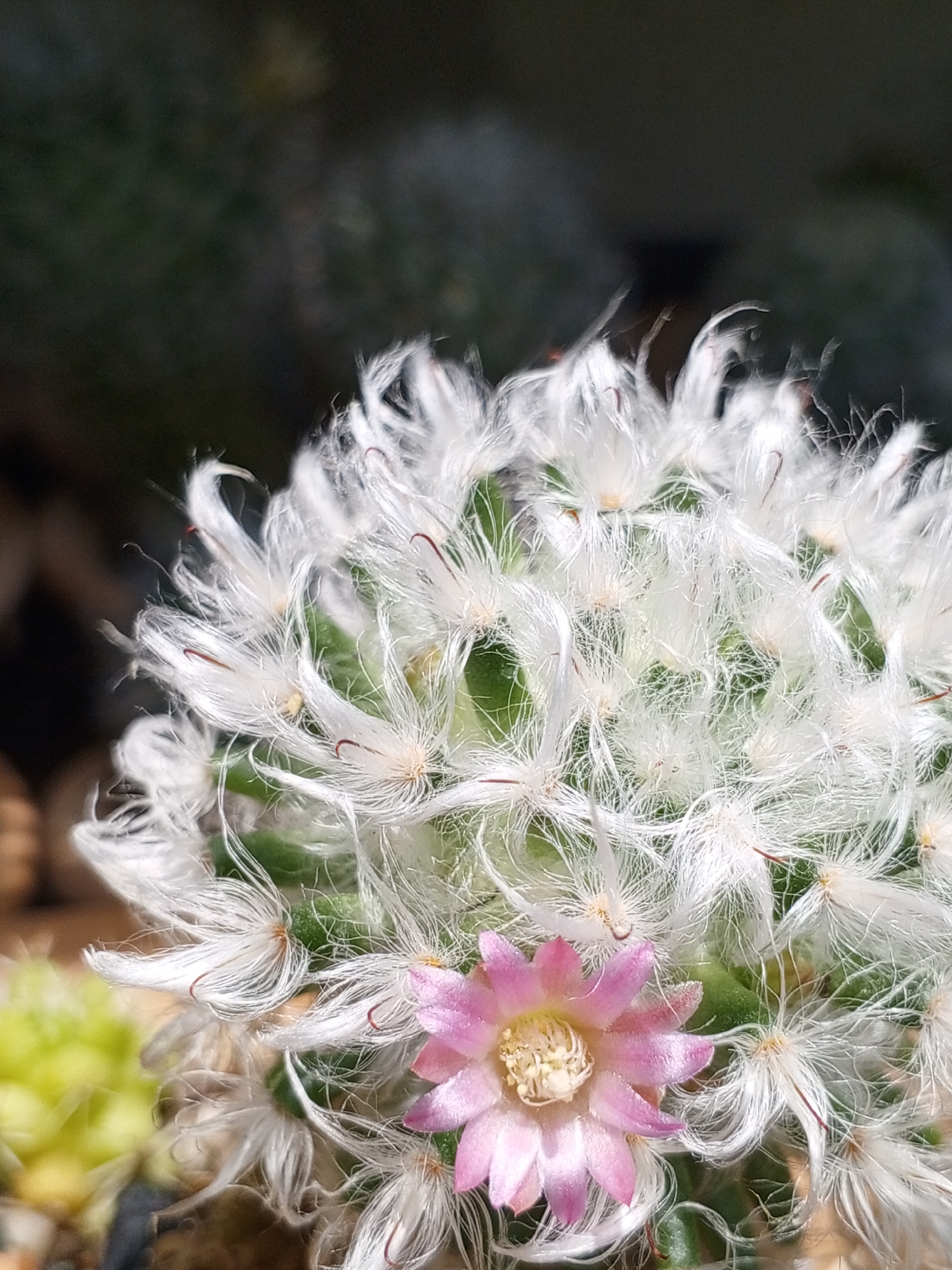 A close-up shot shows a cactus with a pink flower in bloom, situated within a garden setting. The cactus is covered in white, hair-like spines. A single pink flower blooms on the cactus, with a yellow center. The background is blurred, showing other plants and objects. The setting is presumably Bangkok, Thailand.