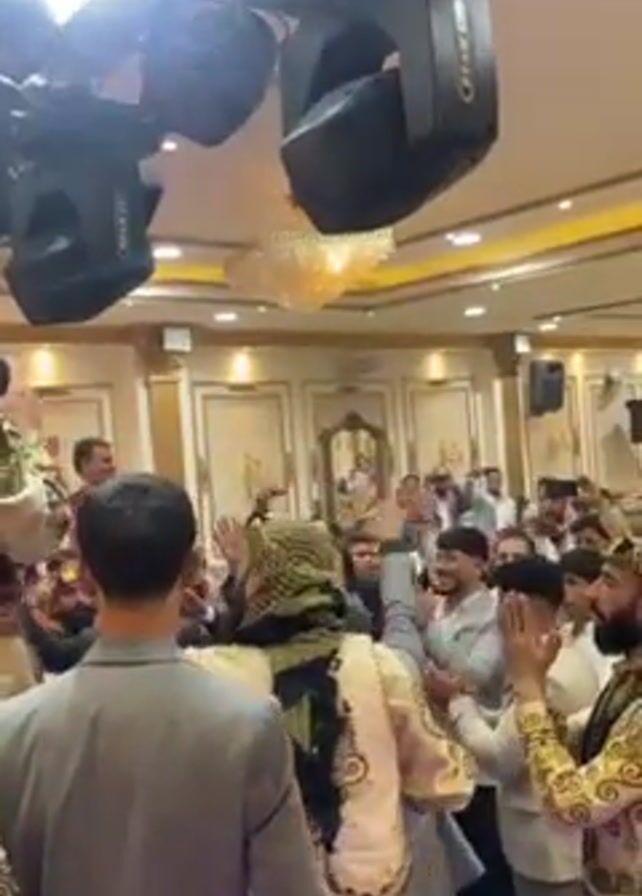 large gathering of people inside a decorated hall. The focus is on a group of men wearing traditional Middle Eastern clothing, with black-and-white keffiyehs and ornate vests. They are dancing and clapping their hands, seemingly celebrating. The hall has ornate paneling, a chandelier, and stage lights. Other people in the crowd are clapping and cheering along.